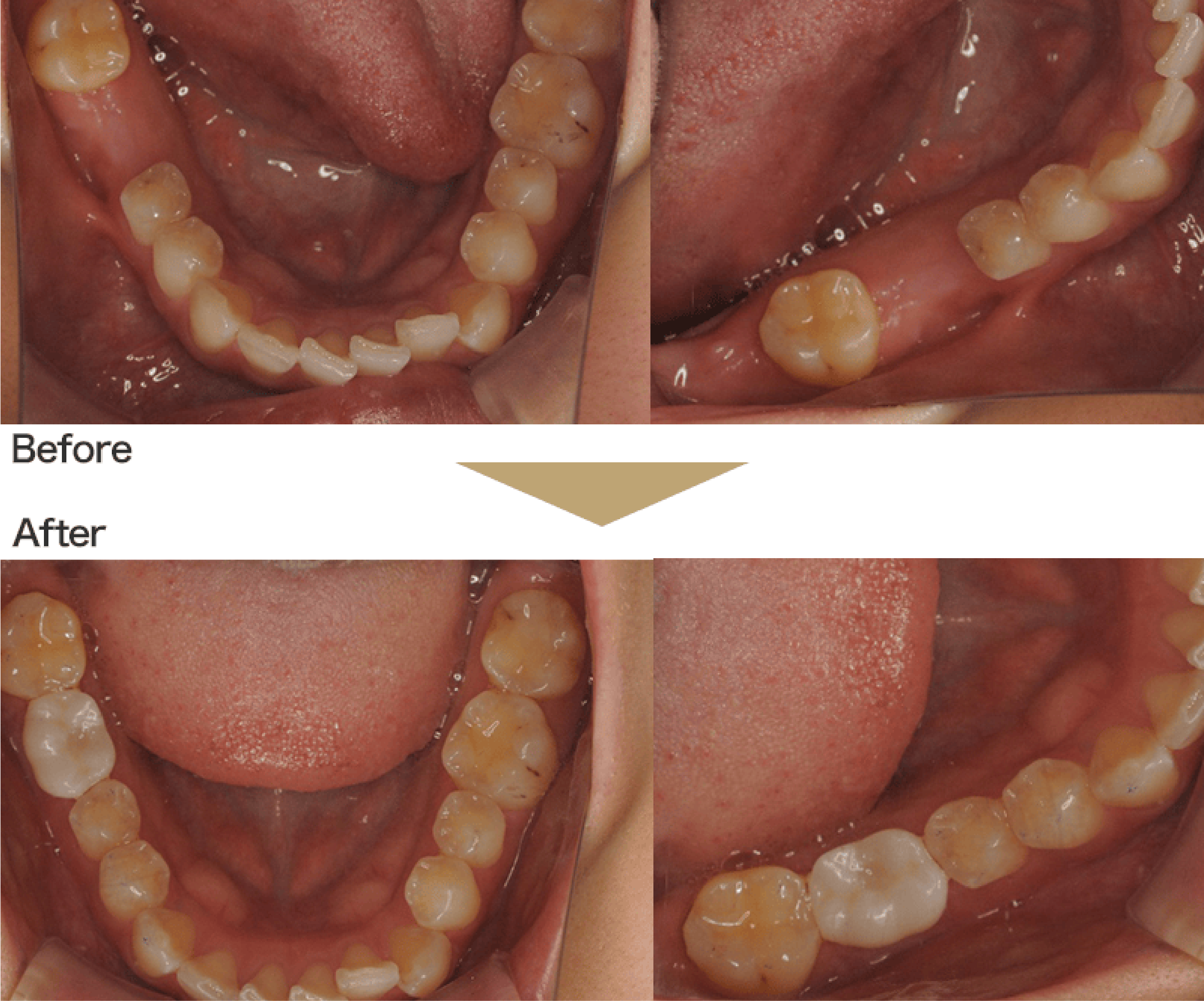 このようなケースでは、傾いた歯の位置を整えるために矯正治療や、被せ物による調整が必要になることがあり、治療が複雑化し、期間も長くなる可能性があります。