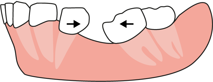 歯を失った部分をそのままにしておくと、両隣の歯が倒れ込んでくることがあります。そうなると、後から人工の歯を入れようとしても、必要なスペースが確保できず、スムーズに治療が進まない場合があります。
